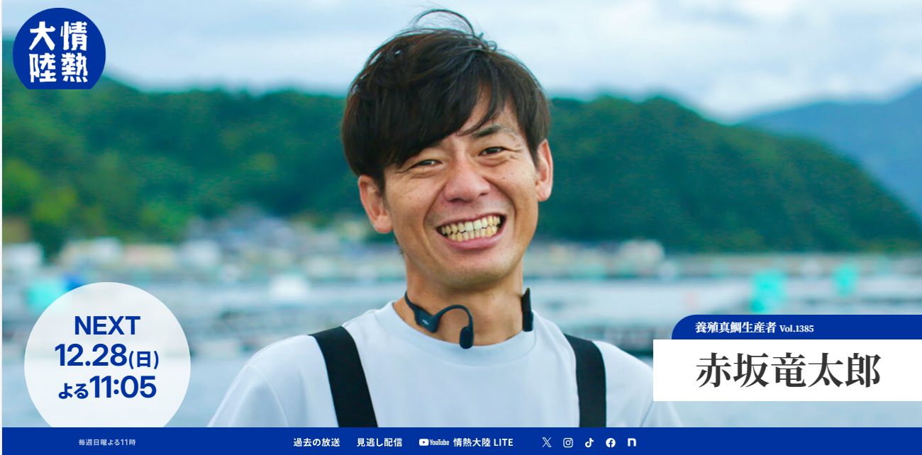 2025年12月28日(日)23時05分より、MBS/TBS系ドキュメンタリー番組「情熱大陸」にて、養殖真鯛生産者として、赤坂竜太郎が特集されます。